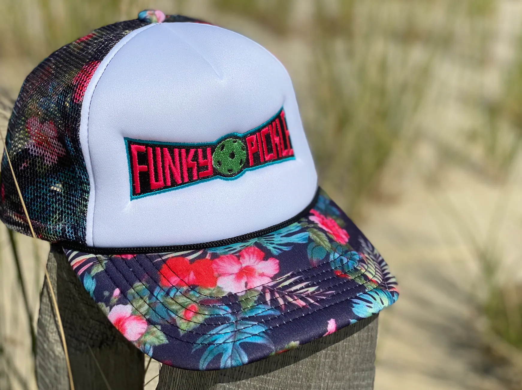 Summer might be coming to an end, but you don't have to stop vibing on the courts! Keep the sunshine vibes alive with our special, limited edition "Endless Summer" Funky Pickle floral trucker hat. The vibrant floral pattern on the brim and mesh backing pops with color to compliment the white foam front, embroidered with a bold Funky Pickle logo in matching colors. This hat is a VERY limited run and one-time supply! Get one before they're gone!